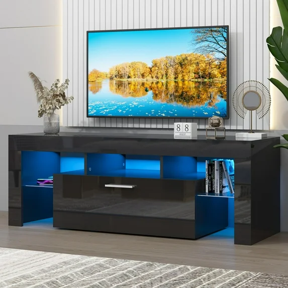 Upgrade your entertainment space with the UHOMEPRO TV Stand, designed for TVs up to 55″. Features sleek black high-gloss finish and built-in RGB LED lights for a modern look. Multiple storage shelves keep media devices, consoles, and accessories organized. Perfect for living rooms, combining style, functionality, and convenience. Durable design supports your TV securely while enhancing room ambiance.